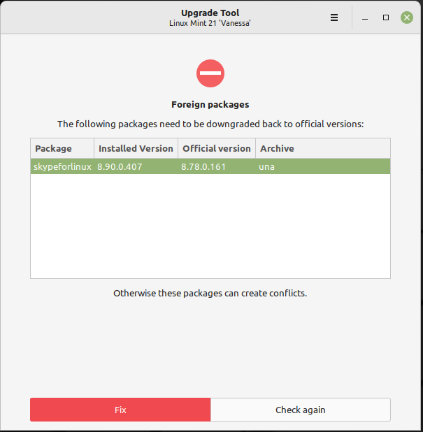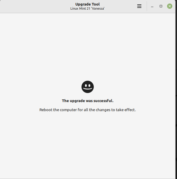 After a while, the Upgrade Tool might report on the foreign and orphan packages (as seen in Phase 1). A click on the "Fix" button will now downgrade or remove the mentioned packages, depending on how the Upgrade Tool suggests to fix the incompatibility. When this is done, you are greeted with a smiley, asking you to reboot the system as the upgrade is completed.