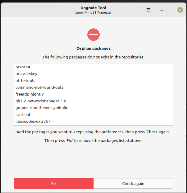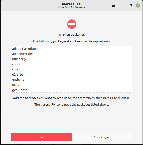Next up the Upgrade Tool checks for repositories and other sources of packages as well as packages themselves which might be or are incompatible with the next version of Linux Mint. Write these repositories and packages down as they might be removed during the upgrade and if you need them, you have to install them manually again after the upgrade is completed.