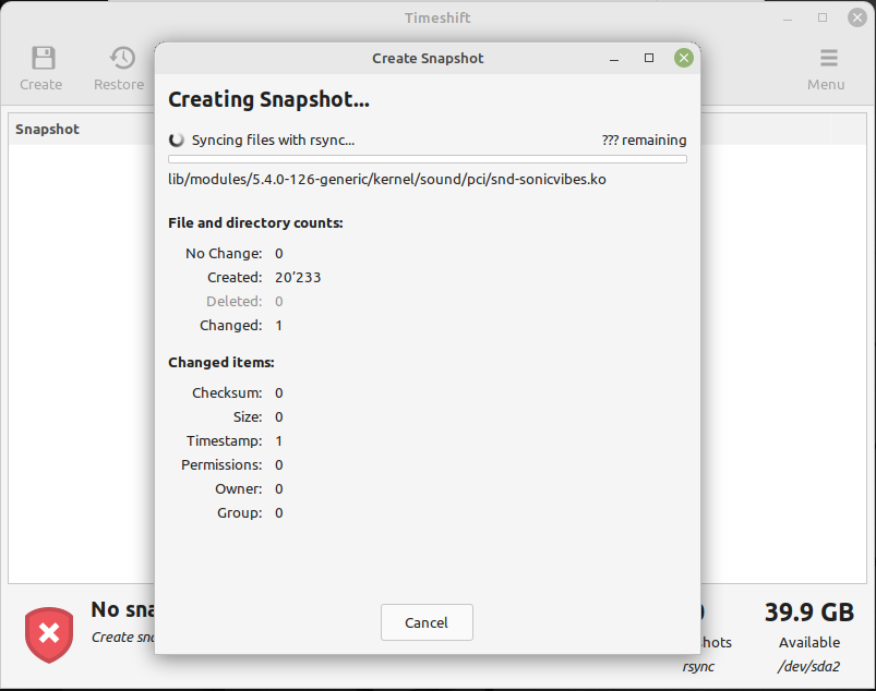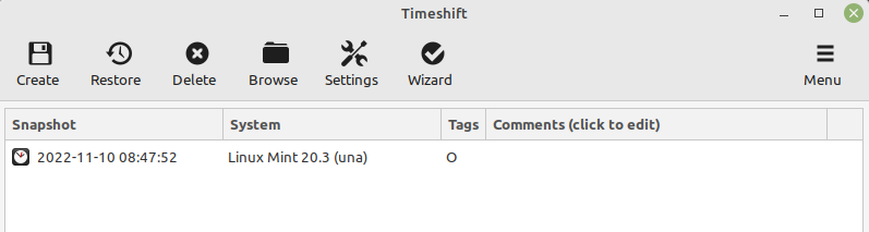 The Upgrade Tool then checks for existing system snapshots. If there are none, you are asked to create one. A click on the "Fix" button opens up Timeshift where you can create a new system snapshot (with a click on the Create/Diskette icon).