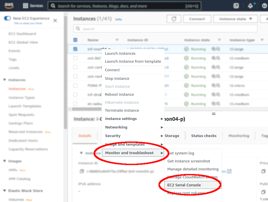 With a right-click on a EC2 instance, select "Monitor and troubleshoot", then click on the "EC2 Serial Console" option.