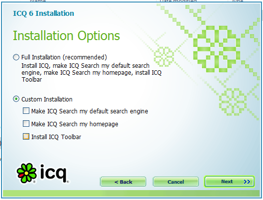 I personally remember that using the full installation choice was a real pain. The ICQ toolbar in the browser was annoying at best. Let's go for the custom installation and remove all these unnecessary tools.