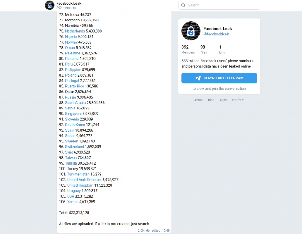 A massive data leak from Facebook was collected and shared online, which includes data from more than 500 million users.