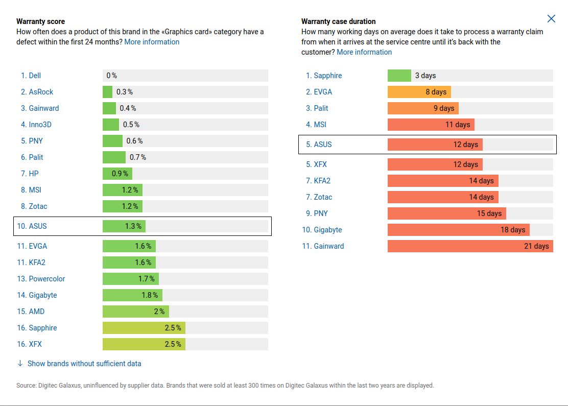 Looking at graphic cards comparison, here's a statistic of warranty returns of many graphic card vendors. The graphic also shows (on the right hand side) how long it usually takes to replace a product: