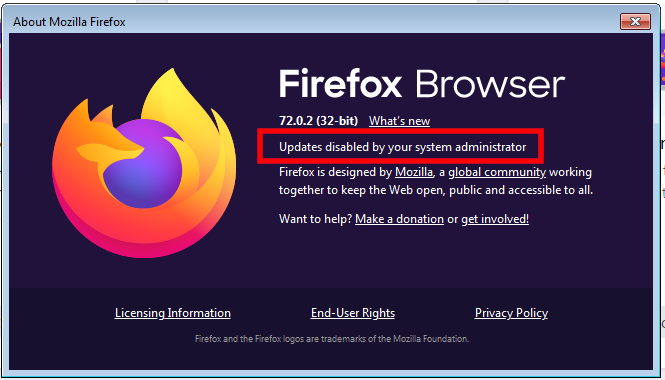Now start Firefox. The "About Mozilla Firefox" window (Firefox Menu -> Help -> About Firefox) should now contain an information, that automatic updates have been disabled by an administrator.