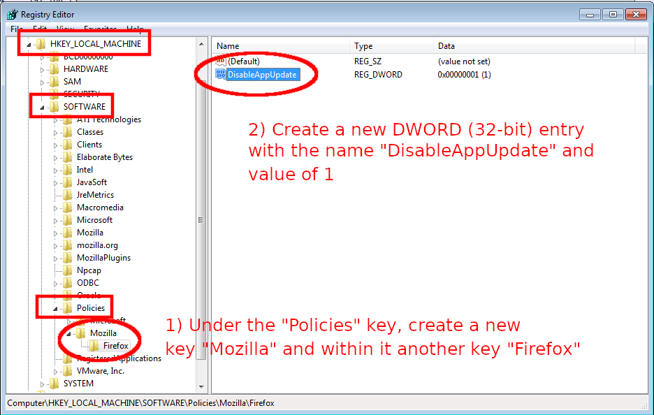 Inside HKEY_LOCAL_MACHINE -> SOFTWARE -> Policies -> Mozilla -> Firefox right click in the right hand side of the window to create a new "DWORD 32bit VALUE" entry. Give this entry the name "DisableAppUpdate" with the value 1. See below screenshot.