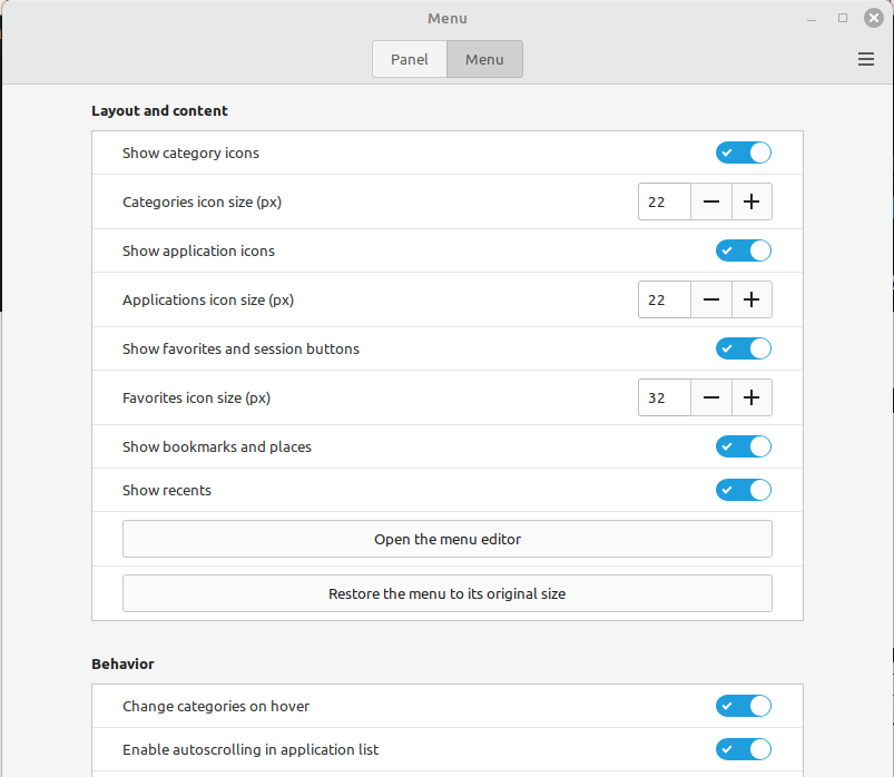 As a long time Linux Systems Engineer, mostly working on the command line on servers, I expected a configuration change under the Launch Menu settings. This can be found with a right-click on the Menu icon, then click on "Configure". Under the "Menu" tab a couple of options can be changed.