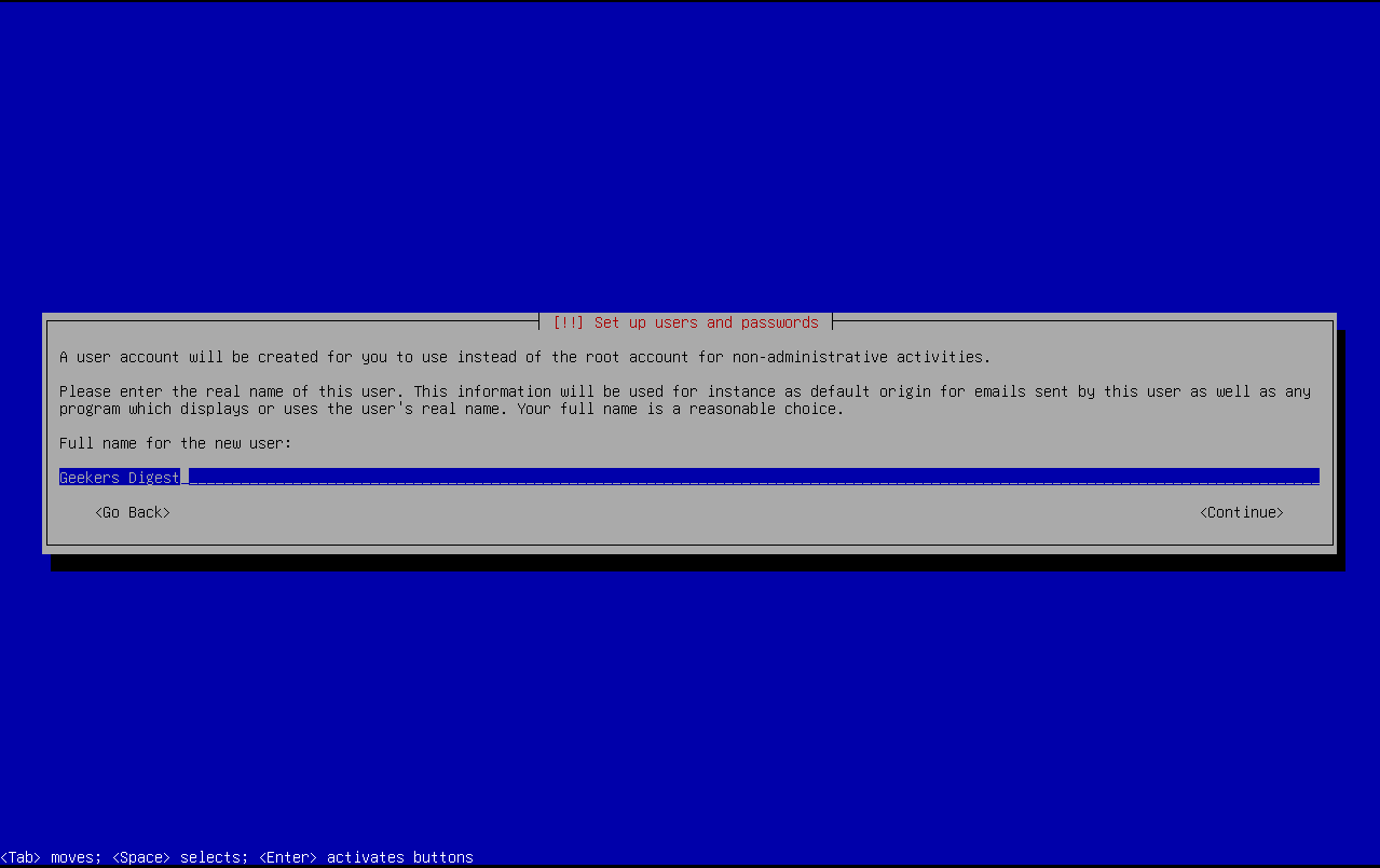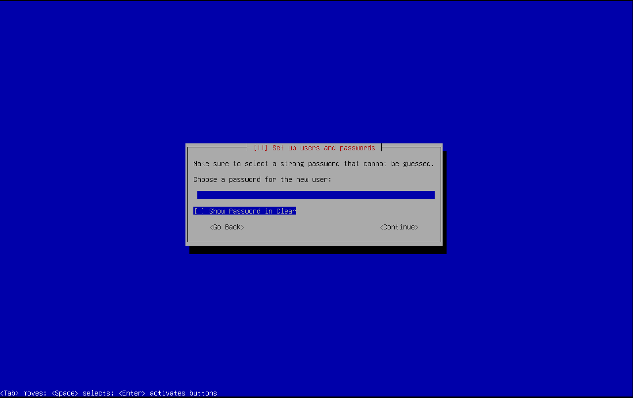 The Debian installer always asks to set up the password for the root user (Ubuntu installation does not do this). If you are new to Linux, the "root" user is the administrator user and has all rights and permissions over this machine. Additional users have only limited permissions. They can be granted higher permissions later on. As first step you must set a password for the root user and then confirm the password.