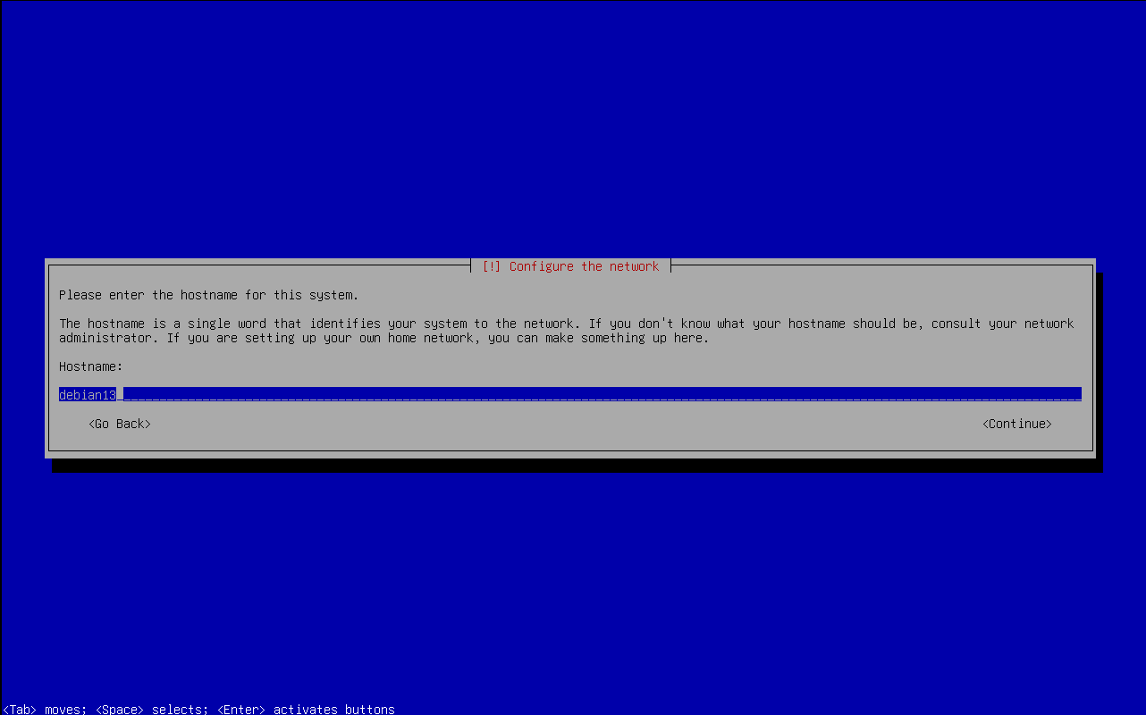 Now it's time to define the hostname of your Debian 13 machine. In this example we simply call it "debian13".