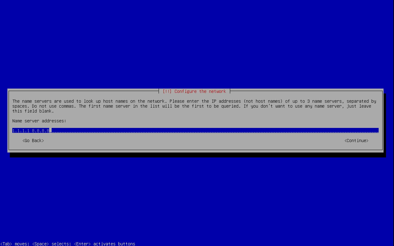In the next step the installer automatically tries to obtain an IP address using DHCP. If your network offers DHCP, the machine will automatically pick up and configure an IP address from the DHCP pool.