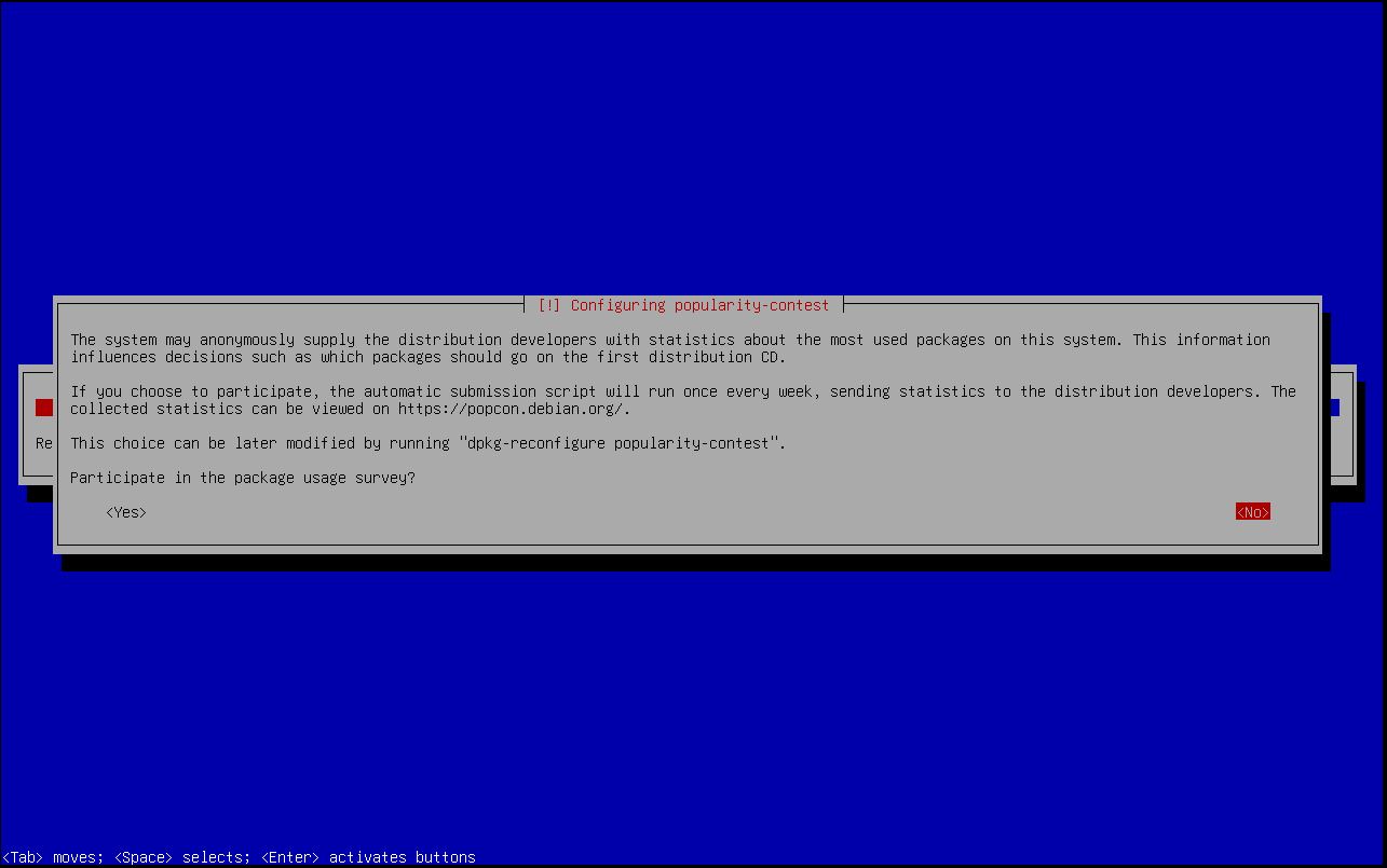 The installer now asks whether or not to participate in the package usage survey. This is an optional anonymous feedback which packages you install on this machine. It helps the Debian developers to decide which packages should be part of the base installation already.