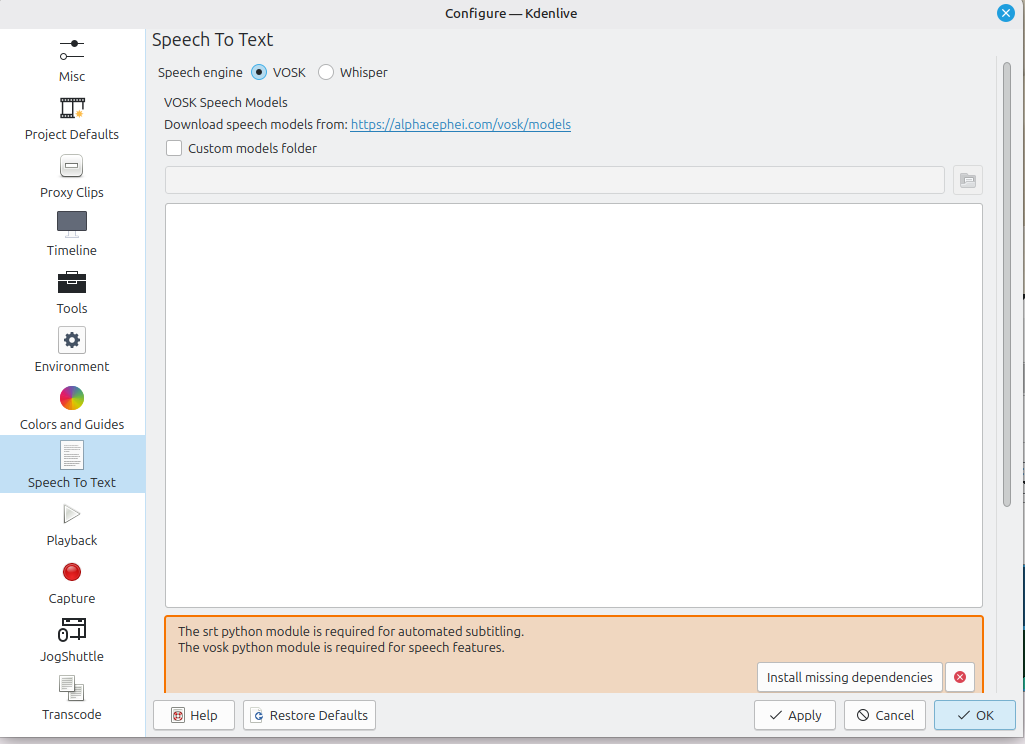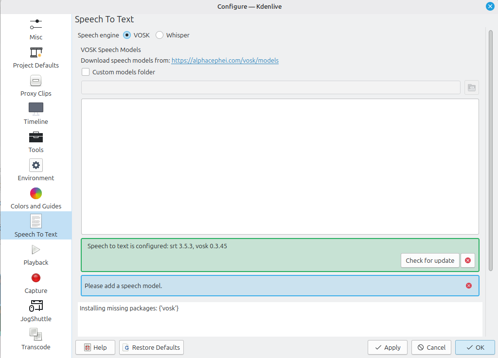 Back in Kdenlive, you can now scroll down a bit and click on the "Check configuration" button. Kdenlive then verifies the Python modules and should show a green background, that all requirements are installed.