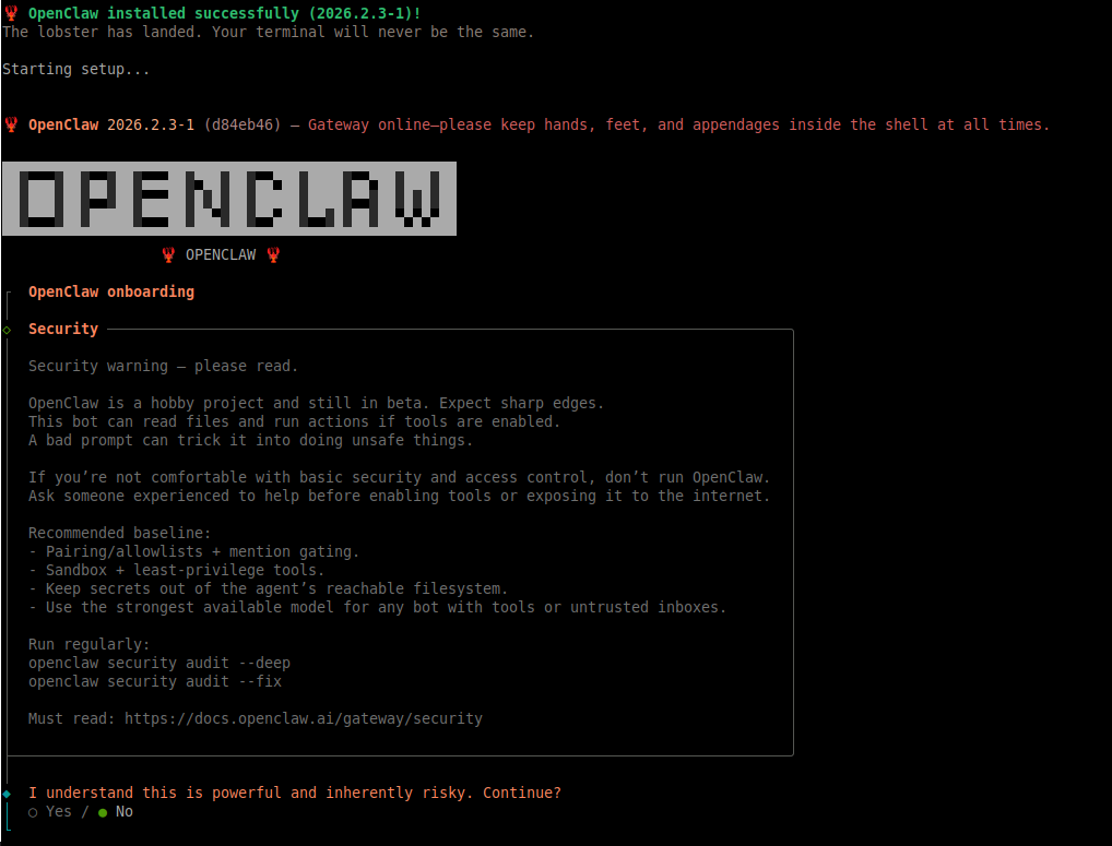 The first part (Security) is a warning, similar to the warnings we added at the top of this howto. Make sure you don't run OpenClaw in a public environment, lock it down as much as possible (sandbox). To continue, use your [left arrow key] and highlight the "Yes" option, then hit [Enter].