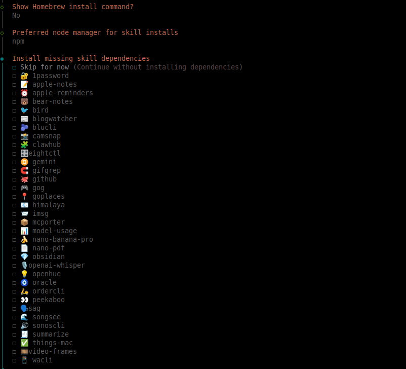 Similar to channels, we can for now also skip the "skills". Use your arrow keys again and highlight "Skip for now" (with your [Space] bar). Then continue with [Enter].