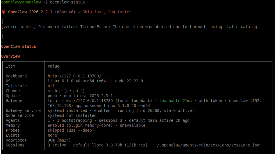 Feb 06 14:10:43 openclaw node[172]: 2026-02-06T14:10:43.581Z [gateway] agent model: venice/llama-3.3-70b