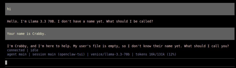 agent main | session main (openclaw-tui) | venice/llama-3.3-70b | tokens 16k/131k (12%)