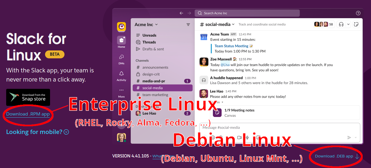 For Debian and its derivatives (Ubuntu, Linux Mint and many more), Slack can also be installed from a public APT repository.
