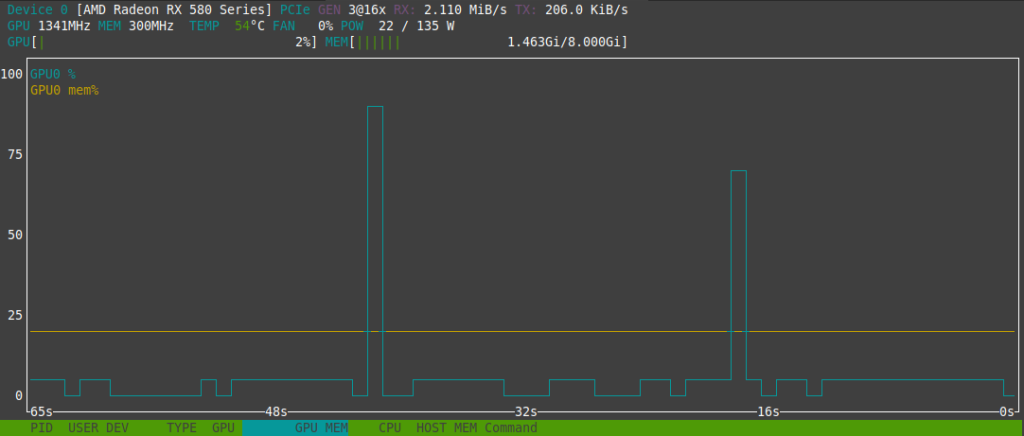To see the GPU usage, it's worth trying the nvtop command. Although the command sounds like "Nvidia Top", it actually means "Neat Videocard TOP" and is compatible with multiple GPU vendors. Fortunately this command is already available in many distribution repositories, such as Debian or Ubuntu. It can be installed as easy as: