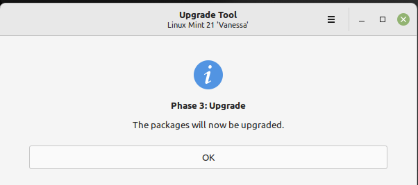 The "Upgrade phase" window will remain for quite a long time as the upgrade will take a while.