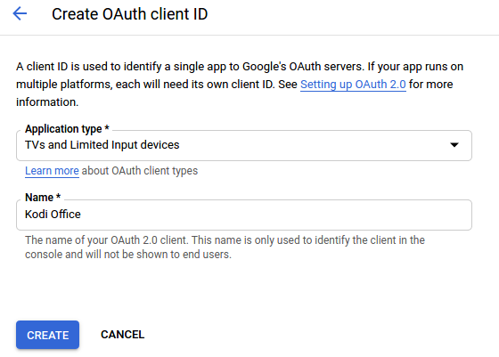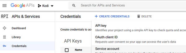 A drop down menu offers three choices: API key, OAuth client ID and Service account. In order to grant Kodi access to Youtube, an API key and OAuth credentials (client ID and secret) need to be created.