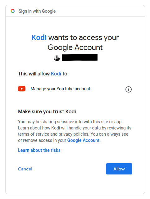 Afterwards, you need to grant access to the device (Kodi) to Youtube, by clicking on Allow. This could look like this window: