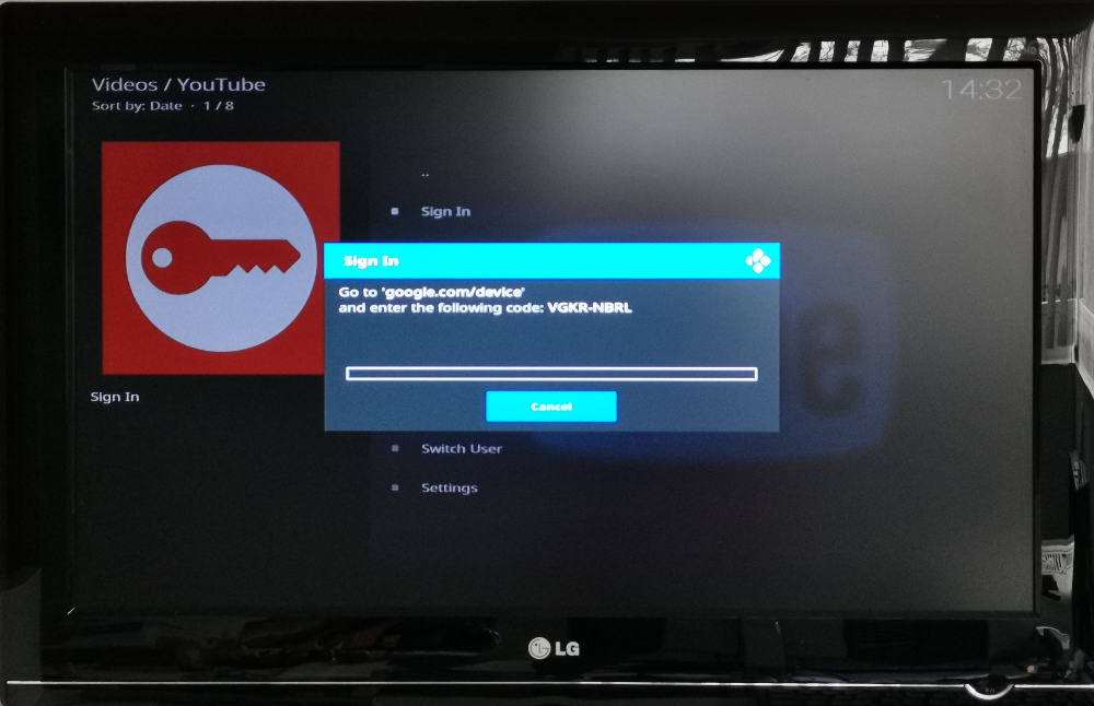 Launch the Youtube add-on in Kodi and select [Sign In]. The plugin should now use the API credentials in the background and then display a code, which needs to be entered on google.com/device.