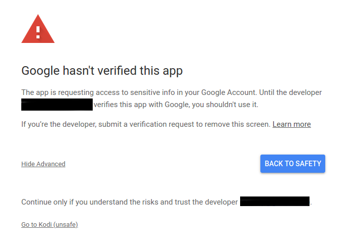 Click on Advanced and then click on [Go to Kodi (unsafe)] and finally the Youtube add-on is able to sign in and you'll be able to play Youtube videos on Kodi!