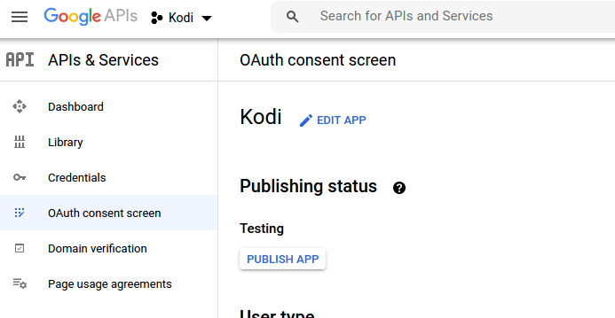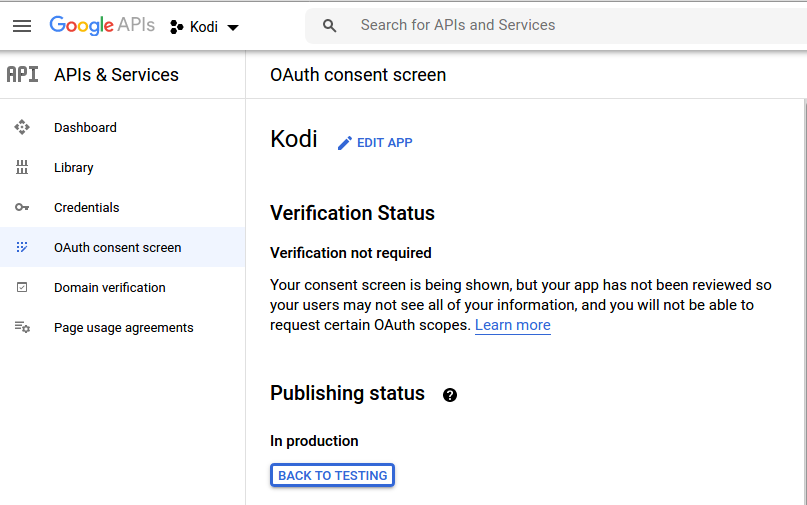 Next thing to do is to configure the OAuth consent screen. This needs to be done before the OAuth 2 credentials (or you will get a message saying this). In the left navigation, click on [OAuth consent screen]. Enter the app name (here I used Kodi) and a support e-mail (your own Google account address) and at the end of the form, click on [Save and Continue].