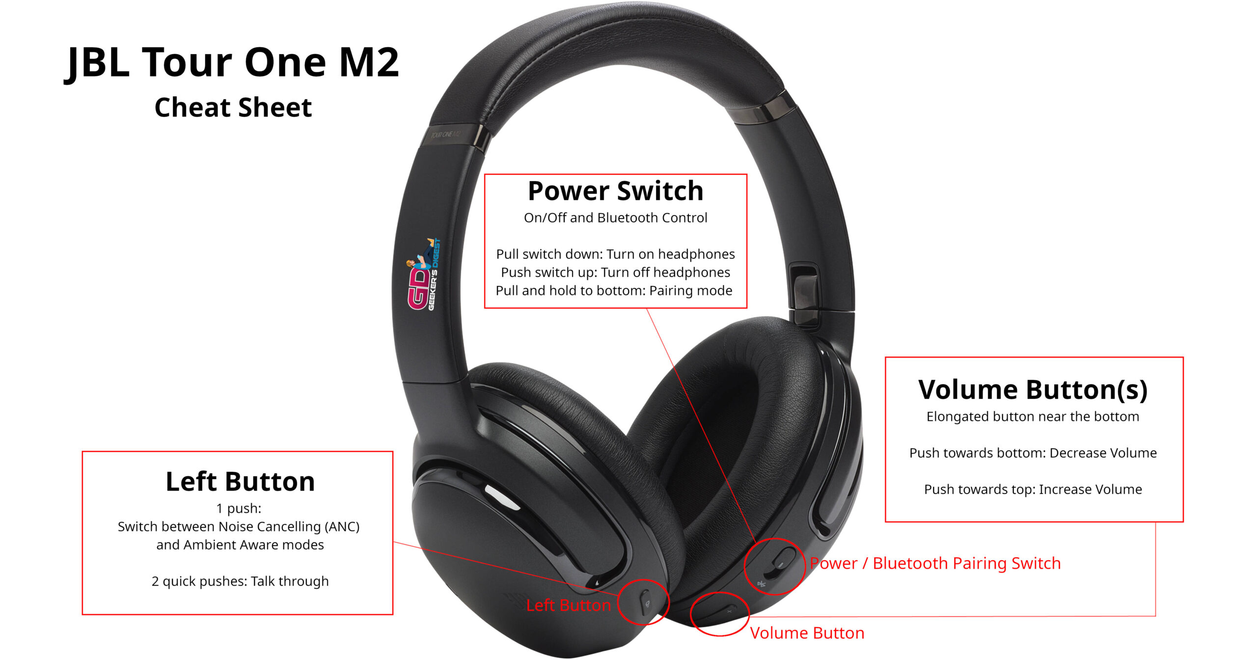 Own a pair of JBL Tour One M2 (link to product on Amazon) Headphones? This cheat sheet will help you to quickly find your buttons and what they do.