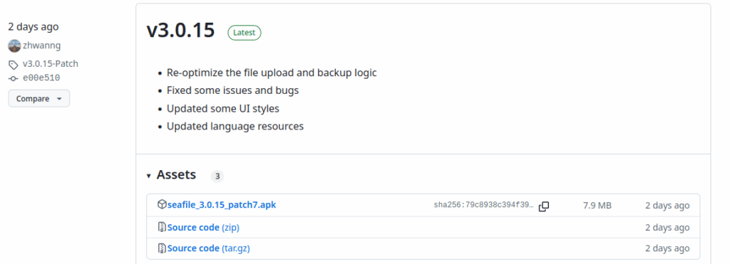 However the app can be updated manually, if you don't want to wait. The Seadroid GitHub repository contains the APK (Android Package) files for each version, including the newest 3.0.15.