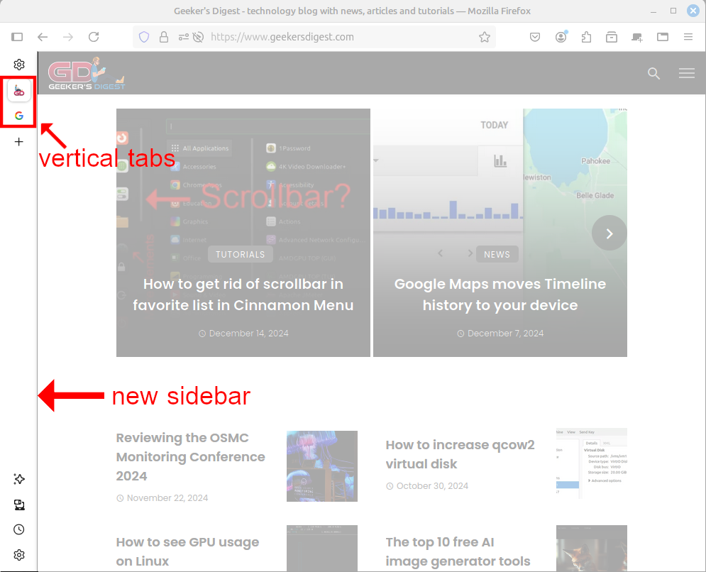 This gives the user the choice whether to use the new vertical side bar and access the browser tabs there, or continue using the horizontal browser tabs, below the address (URL) bar.