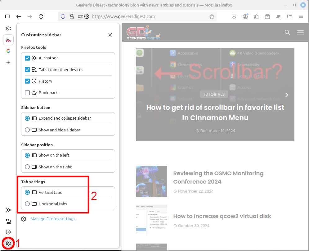 At the bottom of if you can see the "Tab settings". This defines whether to show the browser tabs vertically in the side bar or switch back to the classic horizontal tabs.